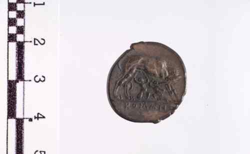Dritto: Testa di Ercole a d., con nastro nei capelli, pelle di leone legata al collo. Intorno cerchio di puntini.. Rovescio: Lupa che allatta i gemelli.