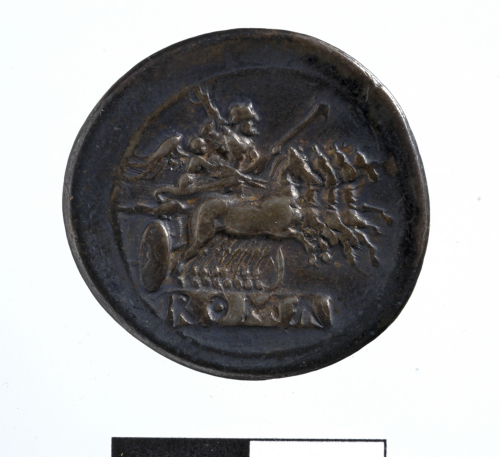 Dritto: Testra laureata gianiforme dei Dioscuri. Cerchio di puntini.. Rovescio: Giove in quadriga a d., guidato da Vittoria. Giove trattiene lo scettro nella mano s. e scaglia un fulmine con la d. Cerchio lineare.