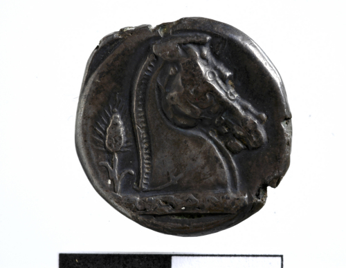 Dritto: Testa elmata (elmo corinzio) di Marte barbato a s.. Rovescio: Testa di cavallo a d.