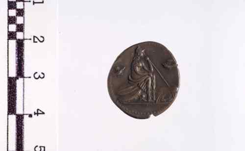 Dritto: Testa elmata di Roma a d. con elmo corinzio alato e ricciolo sulla spalla s. Cerchio di puntini.. Rovescio: Roma, con elmo corinzio, seduta a d. su pila di scudi, trattiene una lancia nella s.; ai piedi, accanto agli scudi un elmo; davanti a lei la lupa allatta i gemelli, ai lati uccelli in volo. Cerchio di puntini.