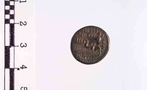 Dritto: Cammello a d.; davanti figura inginocchiata che trattiene le redini nella s. e un ramo di ulivo legato con nastri nella d. Cerchio di puntini.. Rovescio: Giove in quadriga a s. che trattiene le redini nella s. e lancia il fulmine con la d.; sotto la quadriga uno scorpione. Cerchio di puntini.