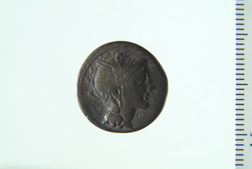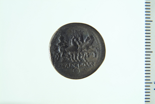 Dritto: Testa di Roma elmata a d.; contorno perlinato. Rovescio: Triga in corsa a d. guidata da Vittoria che tiene le redini; contorno perlinato