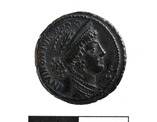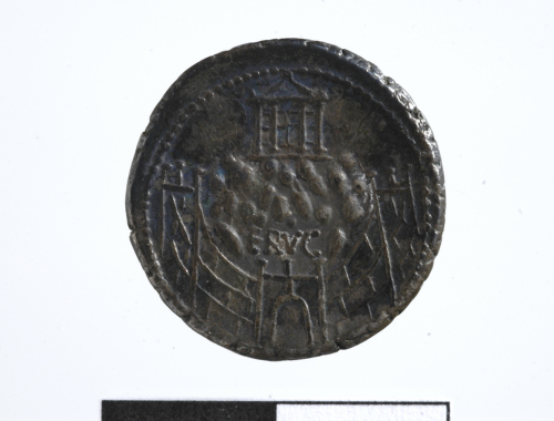Dritto: Busto di Venere a d., laureato, diademato, con orecchino e collana e con capelli decorati. Cerchio di puntini.. Rovescio: Montagna sulla quale si erge un tempio, in primo piano un muro con porta. Cerchio di puntini.