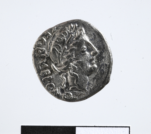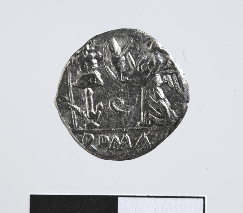 Dritto: Testa laureata di Apollo a d. Cerchio di puntini.. Rovescio: Vittoria a s. inscrive su uno scudo appeso ad un trofeo; accanto al trofeo un carnyx. Cerchio di puntini.