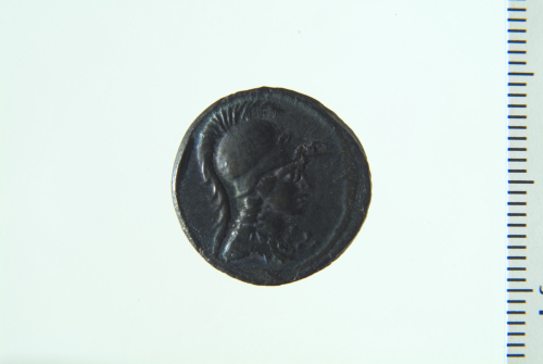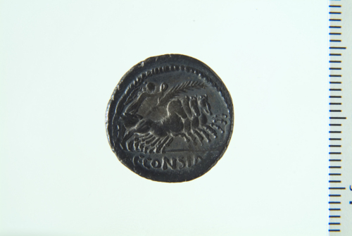 Dritto: Busto elmato di Minerva con egida a d.; contorno perlinato. Rovescio: Quadriga in corsa guidata da Vittoria a d con ghirlanda, ramo di palma e redini; contorno perlinato