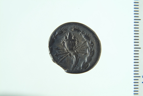Dritto: Testa elmata di Roma a d.; contorno perlinato. Rovescio: Cornucopia che incrocia un fulmine entro ghirlanda intrecciata con spighe di cereali e frutta; contorno perlinato