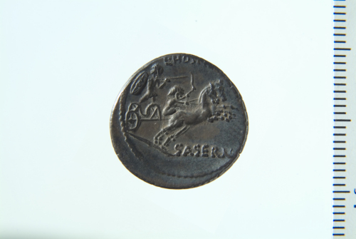 Dritto: Busto maschile barbato a d., a s. scudo gallico; contorno perlinato. Rovescio: Biga in corsa a d. guidata da carrista con redini e frustino, alle sue spalle sulla biga guerrieri stante a d. rivolto indietro in atto di lanciare una lancia; contorno perlinato