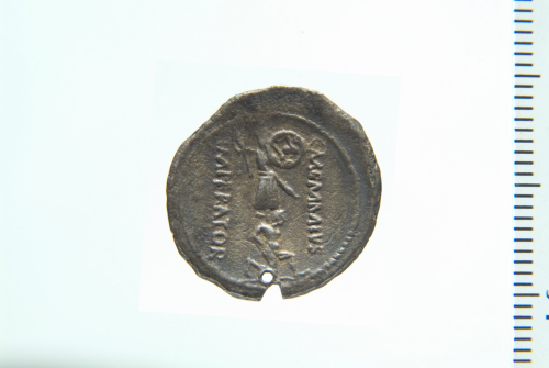 Dritto: Testa di Cerere a d.; contorno perlinato. Rovescio: Trofeo davanti al quale sta un prigioniero inginocchiato a d. con mani legate dietro la schiena; contorno perlinato