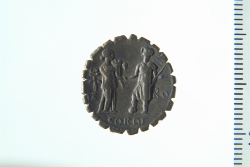 Dritto: Teste accollate di Honos e Virtus a d.; contorno perlinato. Rovescio: Italia stante a s. che stringe la mano a Roma stante a d. con diadema e fasci e piede appoggiato su globo; tra di loro una cornucopia e a s. un caduceo; contorno perlinato
