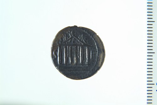 Dritto: Aquila ad ali spiegate su fulmine rivolta a d.; contorno perlinato. Rovescio: Fronte del tempio capitolino esastila decorata con festoni; sul tetto statue di bighe alle estremità e di una quadriga al centro; contorno perlinato