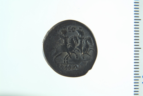 Dritto: Testa elmata di Roma a d.; contorno perlinato. Rovescio: Dioscuri a cavallo in corsa a d.; contorno lineare