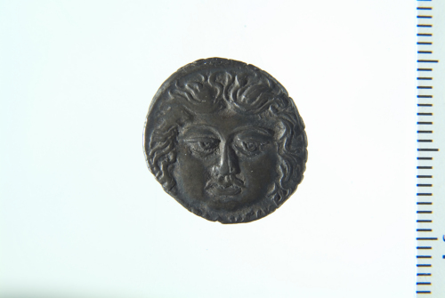 Dritto: Testa di Medusa vista frontalmente; contorno perlinato. Rovescio: Vittoria stante frontalmente con ramo di palma mentre guida quattro cavalli; contorno perlinato
