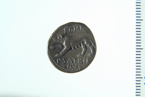 Dritto: Testa elmata di Roma a d., a s. tridente; contorno perlinato. Rovescio: Lupa a s. con zampa sollevata; contorno perlinato