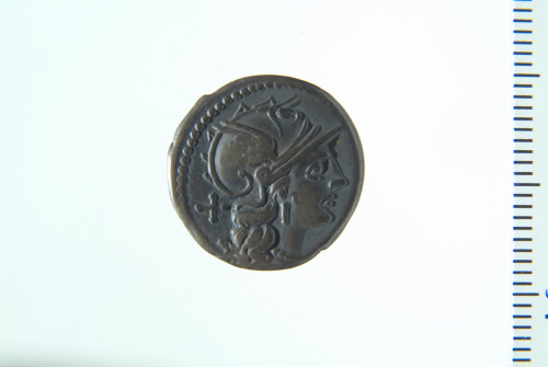 Dritto: Testa di Roma elmata a d.; contorno perlinato. Rovescio: Dioscuri a cavallo a d.; contorno lineare