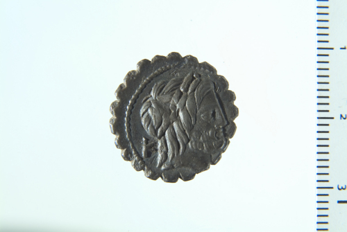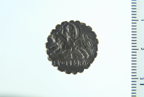 Dritto: Testa laureata di Giove a d.; contorno perlinato. Rovescio: Europa seduta su toro alla carica a s., a d. fulmine, in basso foglia di vite.; contorno perlinato