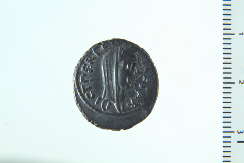 Dritto: Testa laureata e velata di Cesare a d.; contorno perlinato. Rovescio: Venere stante a s. con Vittoria, appoggiata col gomito su uno scudo a terra a sua volta appogiato su un globo; contorno perlinato