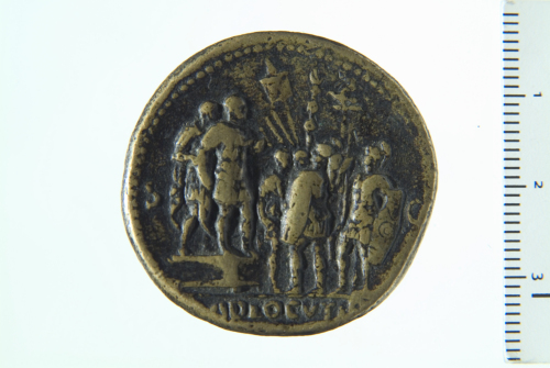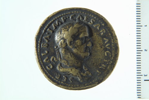 Dritto: Busto laureato e drappeggiato di Galba a d.; contorno perlinato.. Rovescio: Galba stante a d., a testa nuda in vesti militari, su bassa piattaforma, affiancato da un ufficiale; davanti all'imperatore, in primo piano due soldati, entrambi stanti a s., il primo reggente scudo e stendardo, il secondo scudo e spiedo; tra i due è visibile la testa di un cavallo (?); sullo sfondo altri due soldati stanti a d.,reggenti due spiedi, insegna e aquila legionaria, contorno perlinato.