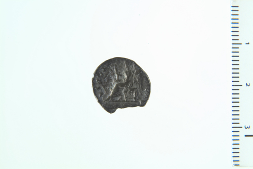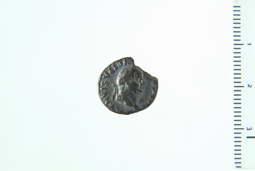 Dritto: Testa laureata di Vespasiano a d.; contorno perlinato (?).. Rovescio: Vittoria seduta a s., reggente palma nella d. e corona nella s. protesa; contorno perlinato (?).