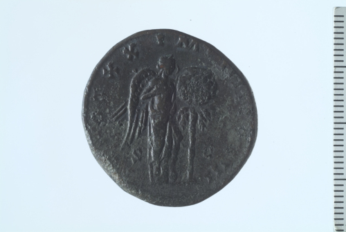 Dritto: Testa laureata di Marco Aurelio a d.; contorno perlinato.. Rovescio: Vittoria stante di fronte, con testa a d., recante palma e scudo appoggiato su una palma, alla cui base sono delle armi; globo in basso a s.; contorno perlinato.