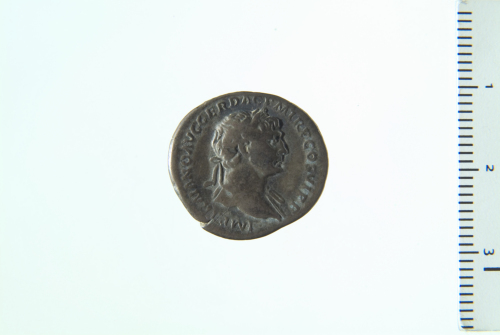 Dritto: Busto laureato di Traiano a d., drappeggiato sulla spalla s.; contorno perlinato (?).. Rovescio: Arabia stante in posizione frontale, la testa girata a s., reggente ramo nella d. protesa e fascio di canne (?) nella s.; ai suoi piedi, cammello a s.; contorno perlinato.
