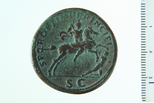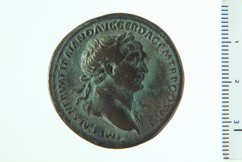 Dritto: Busto laureato di Traiano d., drappeggiato sulla spalla s.; contorno perlinato.. Rovescio: Traiano su cavallo al galoppo verso d., brandente spiedo; ai piedi del cavallo, uomo dacico soccombente; contorno perlinato.