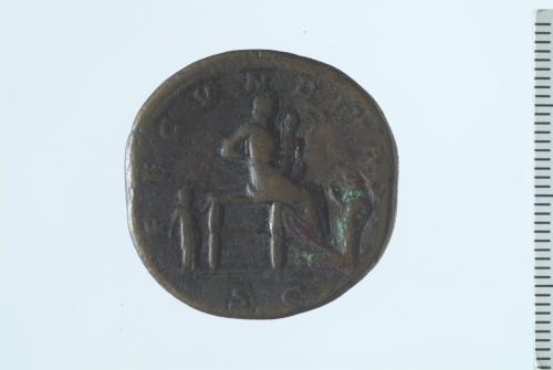 Dritto: Busto drappeggiato di Lucilla a d.; contorno perlinato.. Rovescio: Fecunditas (o Lucilla) seduta a d., in atto di allattare un bambino; altri due bambini stanti, uno davanti e l'altro dietro di lei; contorno perlinato.