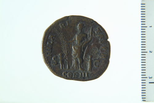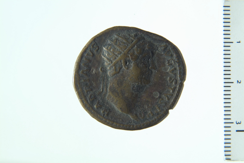 Dritto: Busto radiato di Adriano a d., drappeggiato sulla spalla s.; contorno perlinato.. Rovescio: Hilaritas stante a s. reggente cornucopia nella s. e lunga palma nella d. protesa; a s., fanciullo stante a d., con mano d. protesa verso la palma; a d., fanciulla stante a s.; contorno perlinato.