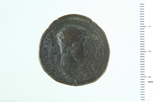 Dritto: Busto radiato di Adriano a d., drappeggiato sulla spalla s. (?); contorno perlinato.. Rovescio: Hilaritas stante a s. reggente cornucopia nella s. e lunga palma nella d. protesa; a s., fanciullo stante a d., con mano d. protesa verso la palma; a d., fanciulla stante a s.; contorno perlinato.