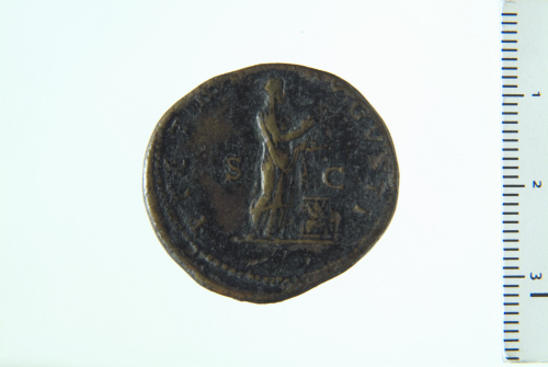 Dritto: Busto radiato di Adriano a d., con paludamentum, di tre quarti in avanti; contorno perlinato.. Rovescio: Pietas stante a d., con d. sollevata e vaso di incenso nella s.; ai suoi piedi, a d., altare acceso; contorno perlinato.