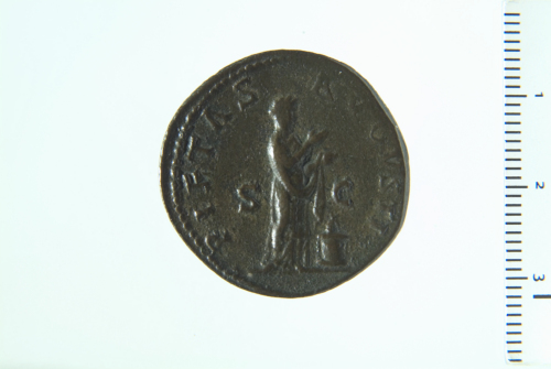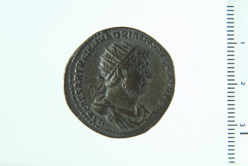 Dritto: Busto radiato di Adriano a d., con paludamentum, di tre quarti in avanti; contorno perlinato.. Rovescio: Pietas stante a d., con d. sollevata e vaso di incenso nella s.; ai suoi piedi, a d., altare acceso; contorno perlinato.
