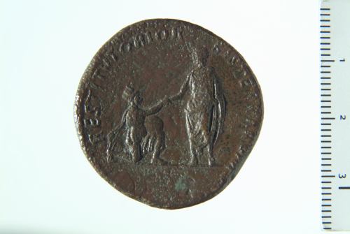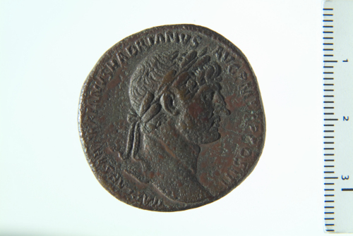 Dritto: Testa laureata di Adriano a d.; contorno perlinato.. Rovescio: Adriano stante a s., reggente rotolo nella s.; mano d. dell'imperatore protesa a stringere la mano d. di una figura femminile turrita, inginocchiata davanti a lui, reggente globo; contorno perlinato.