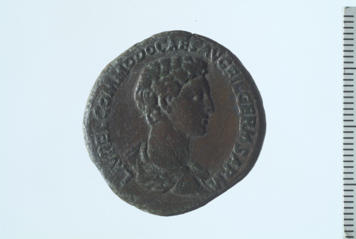 Dritto: Busto drappeggiato di Commodo a d.. Rovescio: Giove stante a s., recante fulmine e scettro; accanto, Commodo stante a s. con trofeo.