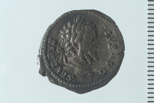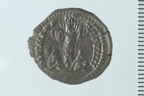 Dritto: Testa laureata di Settimio Severo a d.; contorno perlinato.. Rovescio: Due prigionieri seduti alla base di un trofeo; contorno perlinato.