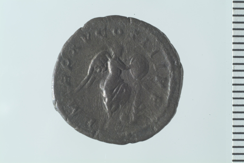 Dritto: Testa laureata di Settimio Severo a d.; contorno perlinato.. Rovescio: Vittoria stante a d., con piede su globo, in atto di scrivere su uno scudo fissato ad una palma; contorno perlinato.