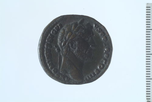 Dritto: Testa laureata di Antonino Pio a d.; contorno perlinato.. Rovescio: Securitas seduta su trono a s., reggente scettro nella d.; braccio s. appoggiato sullo schienale del trono, testa appoggiata alla mano s.; contorno perlinato.