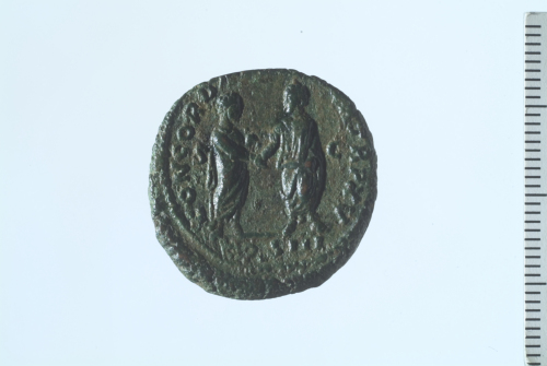Dritto: Testa laureata di Marco Aurelio a d.; contorno perlinato.. Rovescio: Marco Aurelio e Lucio Vero stanti, in atto di stringersi la mano; contorno perlinato.