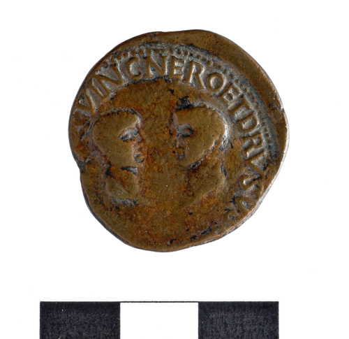 Dritto: T. di Tiberio,barbuto a sin.;TI CEASARES DIVN Augusti F.AUGUSTUS P M.. Rovescio: Teste di Nerone e Druso di fronte;intorno NERO ET DRUSUS / CEASERES QUINQ C V /