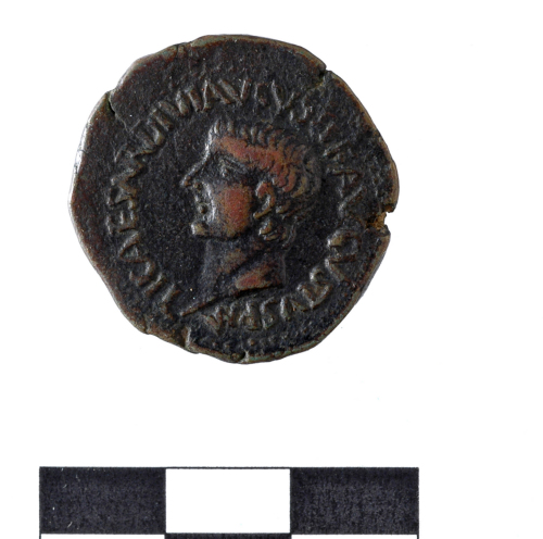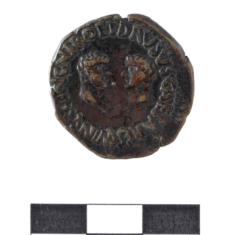 Dritto: testa nuda dell'imperatore a s.TI.CAESAR DIVI AVGVSTI F.AVGVSTVS P.. Rovescio: C.VINC.NHOET DRVSVS CAESARES QUIQ.busti affianco dei due cesari