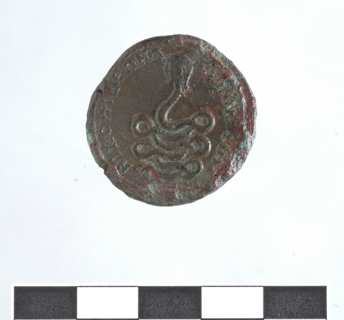 Dritto: Busto laureato a d. ANTONEINOS AYGOVESTOS. Rovescio: Il serpente con tasta umana:NIKOME'DEON D[IS NEOKOR]