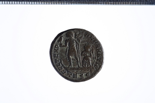 Dritto: Busto corazz. e drapp. con diadema a d.. Rovescio: Imperatore in abito militare stante a s. su imbarcazione con fenice su globo nella d., regge stendardo con inscritto Chi - Rho con la s.; dietro siede Vittoria alata che rema; es.TES(epsilon)