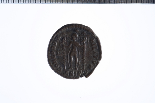 Dritto: Busto diad., drapp. e corazz. a d.. Rovescio: Imperatore stante con trofei nelle mani, cristogramma su ciascun vessillo, es. (delta)SIS(crescente)
