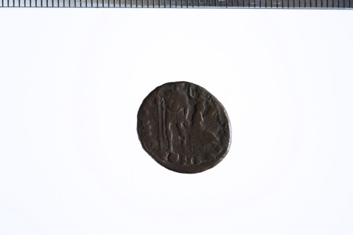 Dritto: Busto diadem., corazz. e drapp. a d.. Rovescio: Imperatore stante tiene lancia con la d. e scudo dietro le gambe; la Vittoria lo incorona a d., es. CONS(delta)
