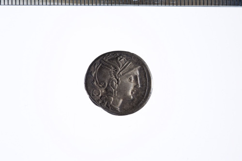 Dritto: Testa galeata di Roma a d.; dietro, un oggetto quadrangolare; c.p.. Rovescio: Vittoria in triga a d. che regge le redini con entrambe le mani; c.p.