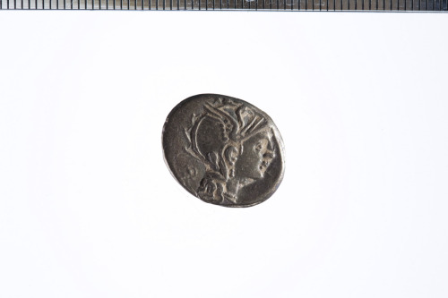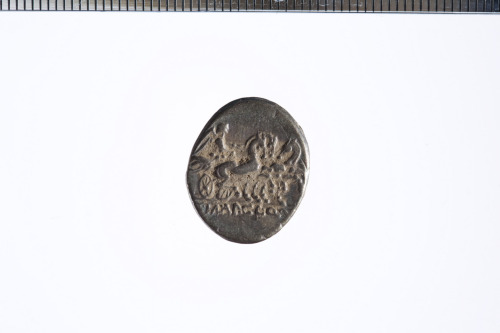 Dritto: Testa galeata di Roma a d.; dietro, un oggetto quadrangolare; c.p.. Rovescio: Vittoria in triga a d. che regge le redini con entrambe le mani; c.p.