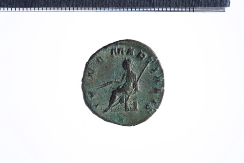 Dritto: Busto radiato e drappeggiato di Treboniano Gallo a d.; contorno perlinato.. Rovescio: Giunone seduta a s. con scettro e spiga di grano; contorno perlinato.