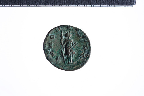 Dritto: Busto radiato e drappeggiato di Treboniano Gallo a d.; contorno perlinato.. Rovescio: Annona stante a d. con timone rovesciato, spiga di grano e piede appoggiato su prua; contorno perlinato.