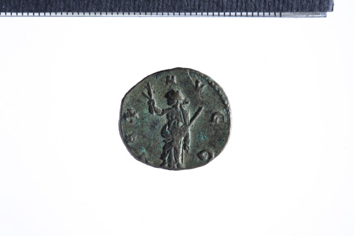Dritto: Busto radiato e drappeggiato di Volusiano a d.; contorno perlinato.. Rovescio: Pax stante a s. con ramo e scettro trasversale; contorno perlinato.