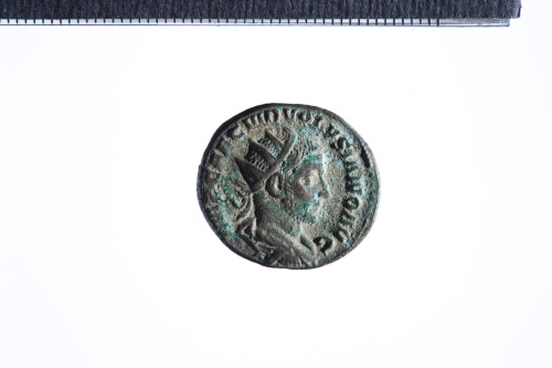 Dritto: Busto radiato e drappeggiato di Volusiano a d.; contorno perlinato.. Rovescio: Pax stante a s. con ramo e scettro trasversale; contorno perlinato.