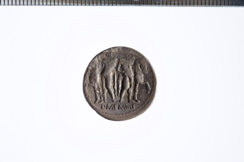Dritto: Testa di un giovane coronata da una corona di quercia a d. (Apollo?); sotto al mento, un asterisco che in questo esemplare non si legge; c.p.. Rovescio: I Dioscuri stanti di fronte, in mezzo ai loro cavalli, ognuno reggente una lancia; c.p.