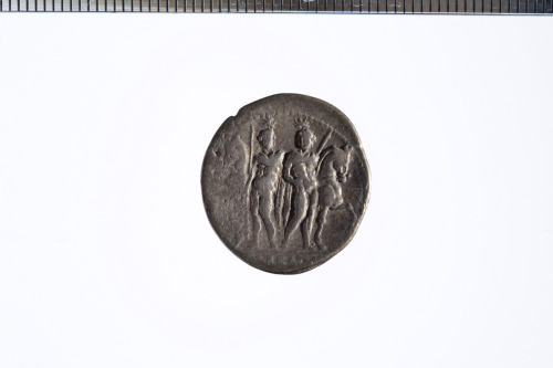 Dritto: Testa di un giovane coronata da una corona di quercia a d. (Apollo?); sotto al mento, un asterisco ; c.p.. Rovescio: I Dioscuri stanti di fronte, in mezzo ai loro cavalli, ognuno reggente una lancia; c.p.